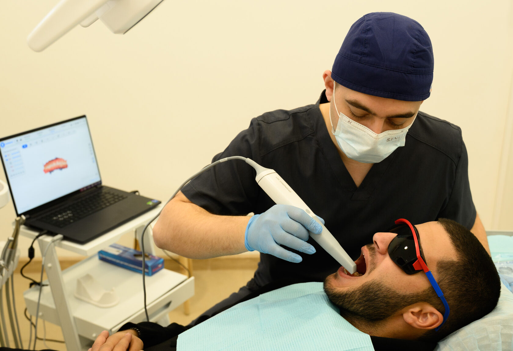 Две высокоскоростные камеры проецируют свет на поверхность зубов, сканируя их форму, положение, размер. Сканирование проводится поочередно — сперва на одной челюсти, потом на другой. 3D-сканер снимает тысячи снимков, которые затем в специальной программе синтезируются в одно цельное изображение — объемную цифровую модель челюсти. Весь результат сканирования отражается на экране в режиме реального времени.
