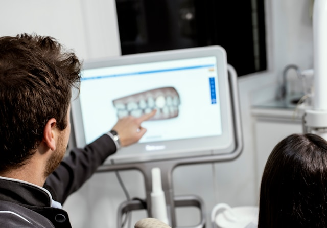 Дантист получает трехмерное изображение челюстей, на котором виды все проблемные зоны зубов. Это помогает ему точно подобрать модель коронок и протезов, назначить правильное лечение.